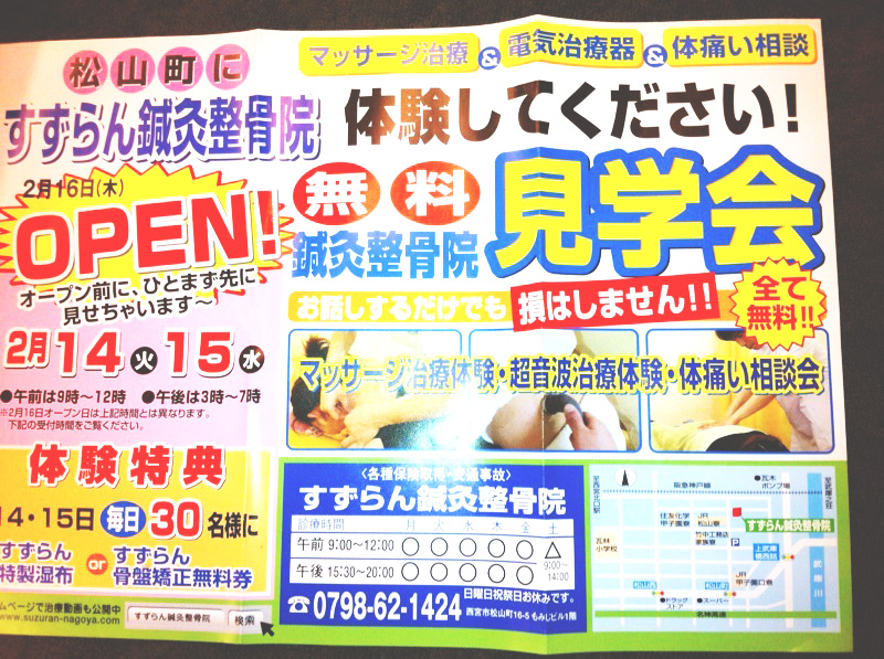 特典:毎日30名様にすずらん特製湿布or骨盤矯正無料チケットを進呈いたします。