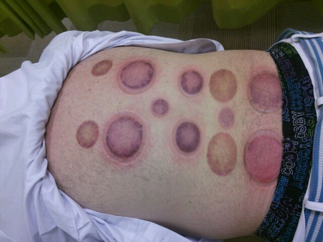 吸い玉をはずした後、血行不良や痛みのある部分に色が付きます。