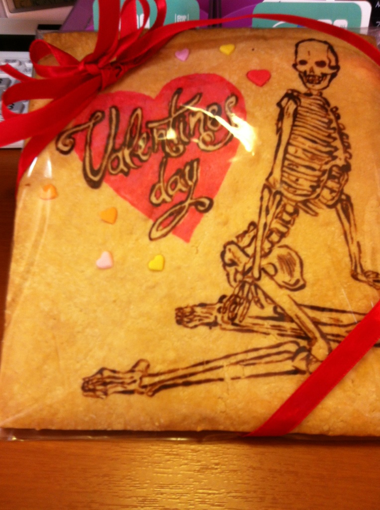 写真のクッキーをいただきました。つまようじを使いチョコレートでガリ男君を書かれたそうです。