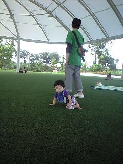 写真は芝生で戯れる我が子との2ショットです。もうハイハイも上手になって、動きまくってます(^O^)