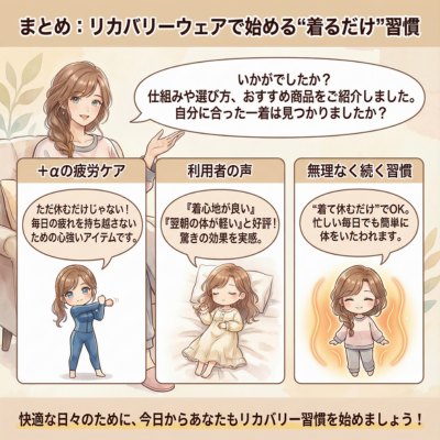 これらのポイントを押さえておけば、自分にぴったりのリカバリーウェアを選びやすくなります。