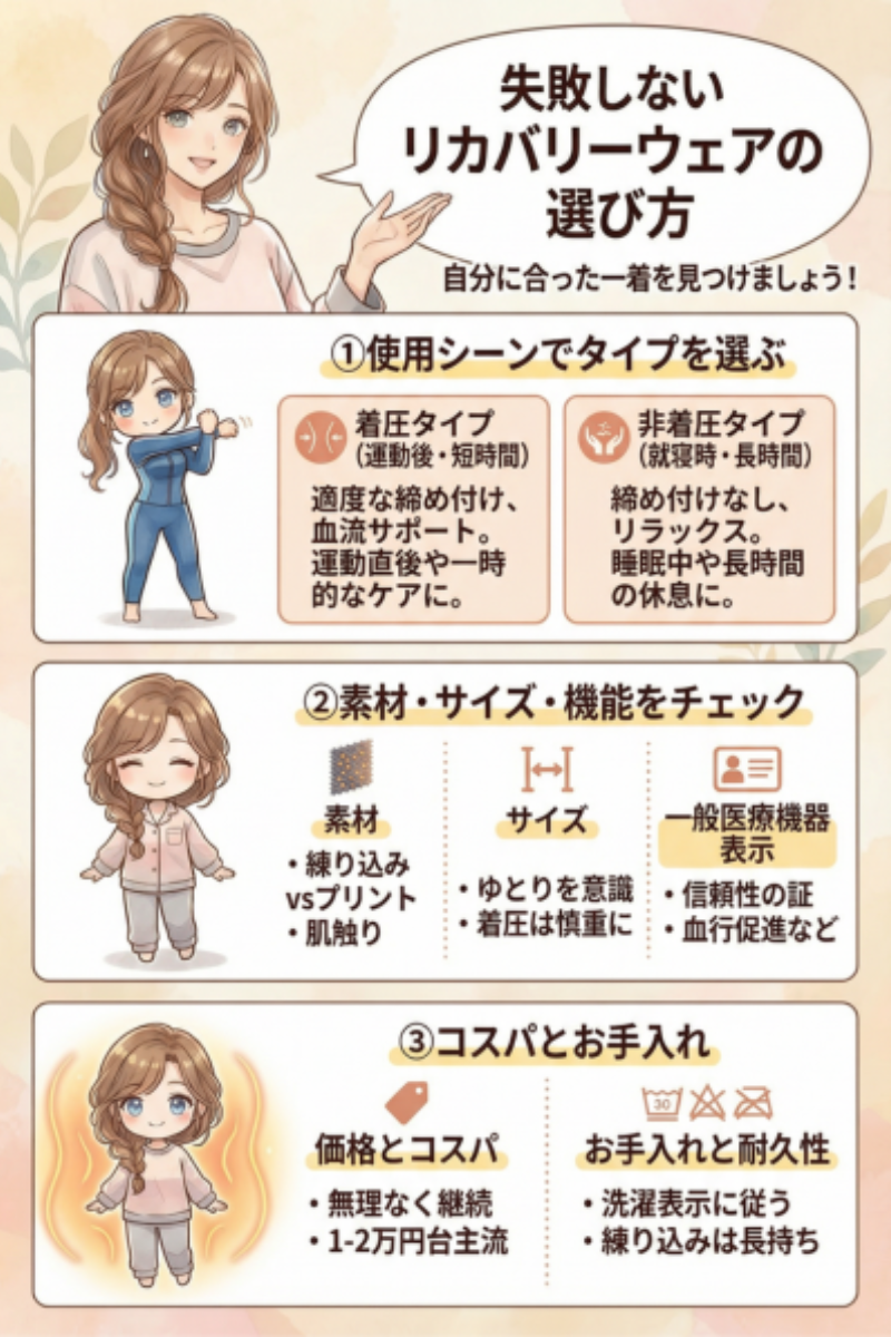 これらのポイントを押さえておけば、自分にぴったりのリカバリーウェアを選びやすくなります。