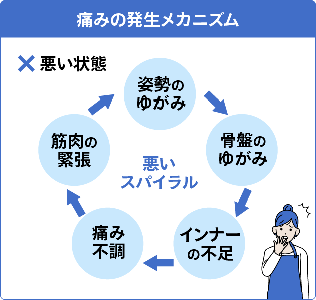 身体の歪み・筋肉の張りなどをチェックし、原因を探します。