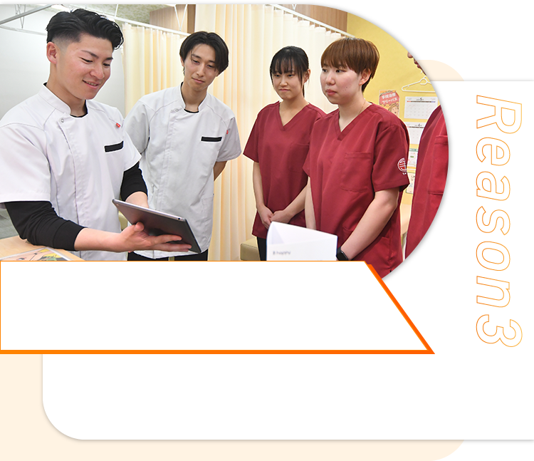 中学生の頃サッカーで膝を怪我した事がきっかけで接骨院に伺い、その時治療して下さった先生に憧れて専門学校へ入学し、現在は3年目で皆様の笑顔と健康のサポートをできる様、日々精進しております。